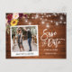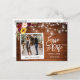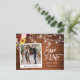 Modern Brush Script, Instant Camera Style, Couple Photo Save The Date Photo Engagement Announcement Postcard - Rustic Country Wood, Mason Jar String Lights. Includes Watercolor Burgundy Floral with burgundy roses, red roses, pink roses, sunflowers and botanical greenery.