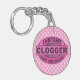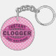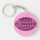 "Instant Clogger: Just Add Music." This cute double-sided keychain design for clog dancers features an oval-shaped banner in shades of pink, purple and white with music notes and stripes. The background is light pink with white polka dots. It's a pretty key chain for the clog dancing fan. See variations and more original clogging designs at our ClogDance shop link!