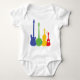 A group of silhouetted and colourful stringed instruments including an electric guitar, a banjo, a violin and a ukulele