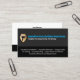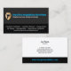 silhouette vector of spray foam insulation gun with white insulation spray against gold gradient shield. Black business card background with blue and white font. Business card also includes services listed.