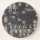 This unusual drinks coaster features a printed circuit board complete with labelled electronic components: resistors, capacitors, transistors. An aesthetic arrangement with contrasting colours of a black circuit board and components in shades of silver labelled in yellow.