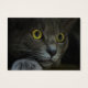 A close-up shot of the face of a grey cat with yellow eyes and dilated pupils, resting his head on his paw and staring intently at something behind the camera.