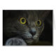 A close-up shot of the face of a grey cat with yellow eyes and dilated pupils, resting his head on his paw and staring intently at something behind the camera.