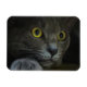 A close-up shot of the face of a grey cat with yellow eyes and dilated pupils, resting his head on his paw and staring intently at something behind the camera.