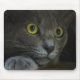 A close-up shot of the face of a grey cat with yellow eyes and dilated pupils, resting his head on his paw and staring intently at something behind the camera.