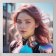 A young woman with flowing, pink-tinted hair is wearing futuristic, reflective armour. She gazes intently at the viewer, while the urban background is softly blurred.