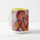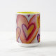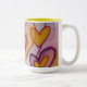 Watercolor painting of hearts interlocking with each other like love from life relationships. The colours are a soft lavender purple, pinks, red, yellows, and gold. This image is meant is a tribute to all those we love in our life. The interlocking love heart connections hold us together in joy and celebrations. It is love too for strengthening our souls for life's challenges. Personalise the heart mug with your own text and images using the Customise It option. Make special Valentine's Day, Wedding, Engagement, Baby, or Love custom mug gifts! Profits from this sale support the non-profit 501(c)3 DonnaBellas Angels.