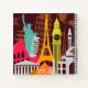 This design features a travel composition of principal landmarks around the world.