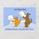 A cartoon ginger cat and dark brown dog on top of a bed having a pillow fight. The image has a sky blue background.