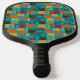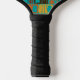 This pickleball paddle has a mid-century modern design of rounded rectangles, in gold, orange, brown, deep red, and dark teal, with holes and thin white lines on top of them, “interrupting” the rectangles. If you like the design but prefer different colours, message me.