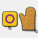 A repeating pattern of the pride flag for intersex people (a purple ring on a yellow background) on the mitt and a single ring on the pot holder.