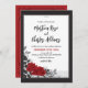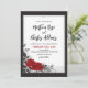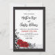 This romantic styled rose wedding invitation features a black frame with two red roses intertwined surrounded by black leaves and swirls. The back of the invitation is a black frame on a red background. Purchase the coordinating wedding items to match (sold separately). Matching items can be found in our 'Intertwined Romantic Red Roses' collection.