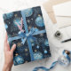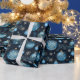 Intricate  blue Christmas baubles on a dark blue background and gold retro stars   - perfect for Christmas gift wrap