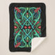 This Sherpa fleece blanket is black with an intricate Celtic Knot design of blue and green intertwined loops with red triangles and four dragon heads with gold horns in each corner.