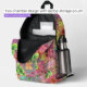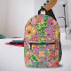 This printed backpack features a vibrant and captivating design. The colour scheme is rich, combining shades of pink, orange, yellow, green, and hints of blue. Against a muted grey background, the vivid colours stand out beautifully. The pattern is dense and intricate, showcasing stylised flowers and foliage. Each element is detailed with fine line work, creating a whimsical yet sophisticated aesthetic. You can personalise this area with any text you like, making it a perfect accessory to reflect your identity or preferences. Whether you’re heading to school, work, or a weekend adventure, this backpack combines functionality with personalised flair!