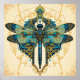 Detailed illustration of a dragonfly with colourful wings surrounded by decorative patterns in gold and blue, showcasing artistic elegance and nature's organic beauty.