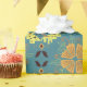 Intricate floral and geometric pattern with orange flowers and yellow circles on a teal background. The design is symmetrical and vibrant.