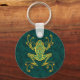 This tribal tree frog is decorated with intricate golden yellow swirls and dot patterns. The interior of the frog is painted a deep blue color that is echoed in the background giving the pattern a beautiful contrast. A shadow falls just beneath the symmetrical tree frog making it appear to float just above the surface of this keychain. This stylized design is a striking representation of this wonderful little creature.