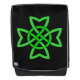 This Bold Face backpack with a interchangeable front face has a large intricate looped vivid green Irish Celtic knot design on a black background.
