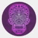 An elaborate Day of the Dead sugar skull design decorated with intricate swirls and dot patterns. The complex lines and circles are colored with a light violet that is highlighted to create a subtle shine on the surface. The interior of the skull is finished with a deep purple that is repeated in the background creating a beautiful contrast. A shadow falls just under the skull making it appear to float just above the surface of the sticker. This stylish design is a striking representation of this symbol from the Day of the Dead.
