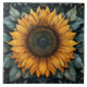 An artistic depiction of a large sunflower with detailed petals on a decorative dark background filled with leaves.