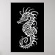 This stylised seahorse design is decorated with intricate swirls and dot patterns. The seahorse is shown from the side with its head bent slightly downward and tail curled up into its body. This beautiful design is a striking representation of this strange and wonderful little sea creature.