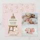 Cute baby girl birth announcement card which you can customise with 2 of your favourite photos, baby's name, birth stats etc. The photo template is set up for you to add your pictures to the front of the card and they are both displayed in landscape format. This design features a wooden easel printed with "Introducing ... " and a cute bunny rabbit teddy bear with a pink bow on a light pink background.