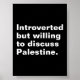 This is a special "Introverted but willing to discuss Palestine" saying design For Palestinians, Palestine lovers Pro-Palestinian, or, everyone who supports freedom and justice and fights injustice. To all supporters of the just Palestinian cause. Rise and support the liberation of Palestine and Gaza and the establishment of peace in Jerusalem. Designed by Peace Lover designers. Stop the Palestine-Israel conflict. Palestinian lives matter. (YOU CAN CHANGE AND CUSTOMIZE THIS TEXT DESIGN!).
