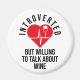 Funny refrigerator magnet that features the text "Introverted But Willing To Talk About Wine'. This magnet makes the perfect gift for people who are introverted but also love wine.