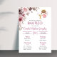 Invita a tus seres queridos al Bautizo de tu hijo con esta invitación, que presenta una linda niña ángel y delicadas flores rosadas. Perfecta para ceremonias de Bautizo y Cristiandad católicas y religiosas.