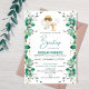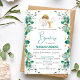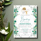 Invita a tus seres queridos a un Bautizo católico con esta invitación que presenta a un lindo angelito rodeado de hojas verdes.