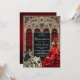 Invitación de quinceañera estilo gótico mascarada en elegantes tonos borgoña y dorado, diseñada para una celebración sofisticada y dramática. Este diseño combina elementos de arquitectura gótica, texturas profundas en rojo y detalles dorados refinados, creando una atmósfera romántica, misteriosa y lujosa.