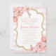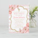 Una invitación simple y delicada para la Primera Comunión, el Bautismo o el Bautizo de su hija con flores de colour rosado y una cruz de colour oro. Los detalles son fáciles de cambiar para adaptarlos a su evento.