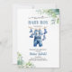 Welcome your little gentleman in style with this adorable baby boy shower invitation! Featuring a sweet clothesline decorated with blue overalls, socks, and a bowtie. This design is accented with soft greenery for a charming, classic touch. The gentle blue tones and playful details create a warm, joyful feel — perfect for celebrating your baby boy’s special day. Personalise with your event details for a keepsake that guests will treasure!