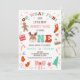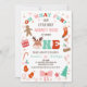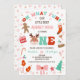 Multicolored retro font oh what fun Christmas season first birthday invitation for a baby girl with a reindeer that spells out one. This Christmas themed first birthday invitation also features a ginger bread man, Christmas trees, Christmas stocking, candy and more. Ideal for a little girl's December birthday party.