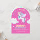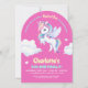 Invitation to a magical birthday party with an adorable unicorn with wings in the clouds on a rainbow background.