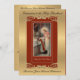 A traditional Catholic Ordination to the Holy Priesthood invitation with a beautiful traditional Catholic image of a priest kneeling at the altar offering the Holy Sacrifice of the Mass with Jesus beside him. The background is a gold shimmer. All text and fonts may be modified.