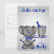 Invite your guests to a divorce party for anyone in general with a card featuring a cute elephant wearing eye glasses decked out in a cute jacket with a bow tie carrying a tray with his trunk. The tray has a bottle of champagne being chilled in a fancy ice bucket against a gradient background with silver stars and text. Design by Laurie Schneider/Elements by La galerie de Jackie/Diana'z Creationz