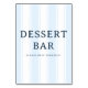 This wedding tabletop sign features a clean, minimalist design with vertical stripes in soft shades of blue, creating a calming and inviting atmosphere. The bold serif font for "DESSERT BAR" is complemented by a friendly sans-serif message below, encouraging guests to indulge freely. The simple layout emphasizes clarity and elegance, making it perfect for guiding guests to the sweet treats at your event. Its modern style and soothing colour palette add a touch of sophistication while maintaining a casual vibe ideal for any dessert station.