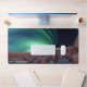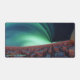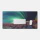 An aurora, green due to ionised oxygen, appears low on the horizon, a city sits in the foreground. Customise by adding your own text.