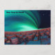 An aurora, green due to ionised oxygen, appears low on the horizon, a city sits in the foreground. Add your own text.