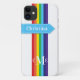 This personalised Case-Mate custom iPhone 11 case has a rainbow-coloured vertical stripes pattern down the centre with a blue banner ribbon running horizontally below the camera that has white stitching and white lettering that you can customise with your name or other text. There is also a 3-letter monogram centred at the bottom. The white background can be changed to be any colour you want. You'll be proud to show off this modern and trendy new case that makes a chic statement! If you need assistance, email niteowlstudio@gmail.com.