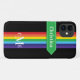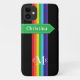 This personalised Case-Mate custom iPhone 11 case has a rainbow-coloured vertical stripes pattern down the centre with a green banner ribbon running horizontally below the camera that has white stitching and white lettering that you can customise with your name or other text. There is also a 3-letter monogram centred at the bottom. The black background can be changed to be any colour you want. You'll be proud to show off this modern and trendy new case that makes a chic statement! If you need assistance, email niteowlstudio@gmail.com.