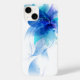 This iPhone 14 case is shown in a white colour with a blue tropical flower print.