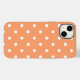 a tough, protective phone case for the iPhone 14 plus in sweet, fresh orange and white polka dots.