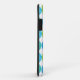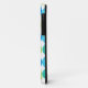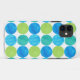 A vibrantly colored case to protect your iPhone 5, with a 'Blue Moons' abstract pattern in bright blues and neon green on a white background; from a handpainted paper collage design by Judy Adamson.
