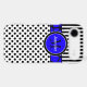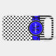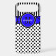 This personalised black and white Case-Mate custom iPhone 6 Plus case has a fun polka dot, striped background pattern with a cobalt blue and black giraffe print band and circle to add your name, initials, monogram or other text to. This modern and trendy new case makes a chic statement for the hip young fashionista! If you need assistance, email niteowlstudio@gmail.com.