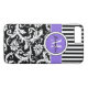 This personalised black and white Case-Mate custom iPhone 7 case has a floral damask and striped background pattern with a lavender purple and white band and circle to add your name, initials, monogram or other text to. This modern and trendy new case makes a chic statement for the hip young fashionista! If you need assistance, email niteowlstudio@gmail.com.
