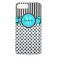 This personalised black and white Case-Mate custom iPhone 7 case has a fun polka dot, striped background pattern with a turquoise blue and black giraffe print band and circle to add your name, initials, monogram or other text to. This modern and trendy new case makes a chic statement for the hip young fashionista! If you need assistance, email niteowlstudio@gmail.com.