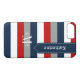 This nautical inspired personalised navy blue, white, red, and grey Case-Mate custom iPhone 7 case has a bold striped background pattern and a banner ribbon with white stitching that you can add your name, initials, monogram or other text to. This modern and trendy new case makes a chic statement for the hip young fashionista! If you need assistance, email niteowlstudio@gmail.com.